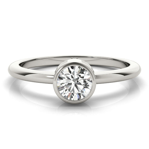 This elegant engagement ring features a stunning round brilliant diamond securely nestled within a sleek bezel setting. The classic band, crafted from polished metal, complements the modern simplicity of the design, offering a timeless appeal. The bezel setting not only enhances the stone's brilliance but also provides exceptional protection, making it an ideal choice for those seeking both beauty and durability. Perfect for any occasion, this ring embodies sophistication and understated elegance.