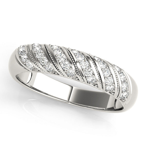 This elegant dome band features a stunning array of round diamonds set in a channel setting, creating a seamless and sophisticated look. The smooth, polished band beautifully complements the brilliance of the diamonds, while the secure channel setting ensures durability and comfort. Perfect for any occasion, this exquisite piece combines timeless design with modern elegance.