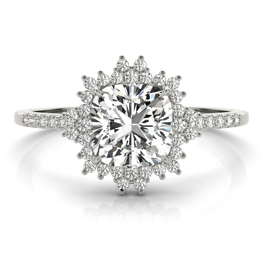 This exquisite ring features a dazzling cushion cut diamond at its center, surrounded by a stunning halo of smaller diamonds that enhance its brilliance. The pave band is meticulously crafted, adding an extra layer of sparkle and elegance. Secured with a classic four-prong setting, this ring is a perfect blend of timeless elegance and modern sophistication, making it an ideal choice for those who appreciate refined beauty.
