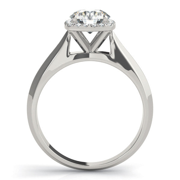 This exquisite ring features a stunning round brilliant cut diamond, elegantly set in a cushion-shaped halo that enhances its brilliance. The centerpiece is securely held by a classic four-prong setting, ensuring both beauty and durability. The tapered band gracefully narrows towards the halo, providing a sleek and modern aesthetic, while the surrounding smaller diamonds add a touch of sparkle and sophistication. Perfect for any special occasion, this ring embodies timeless elegance and contemporary charm.