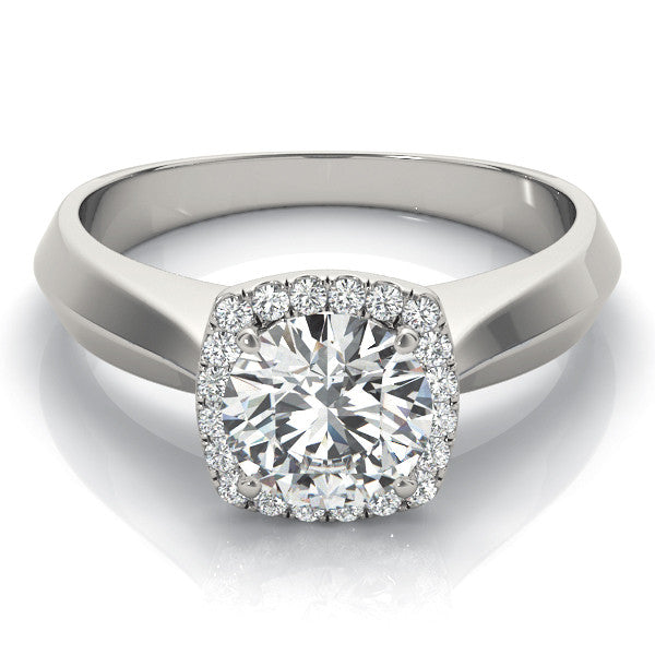 Platinum Cushion Halo Round Brilliant Solitaire Ring with Tapered Band and Four-Prong Setting