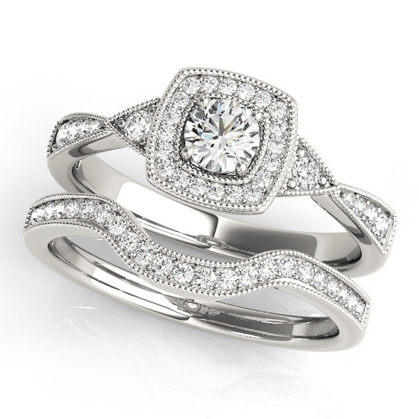 Platinum Cushion Halo Round Diamond Milgrain Pave Engagement Ring