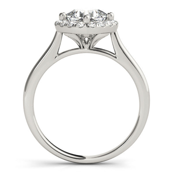 This exquisite engagement ring features a stunning round diamond set in a cushion-shaped halo, accentuating its brilliance. The solitaire diamond is securely held by a four-prong setting, ensuring maximum sparkle and durability. The elegant band is adorned with pave-set diamonds, adding a touch of sophistication and glamour. Perfect for those seeking a timeless and elegant design, this ring beautifully combines classic elements with modern elegance.