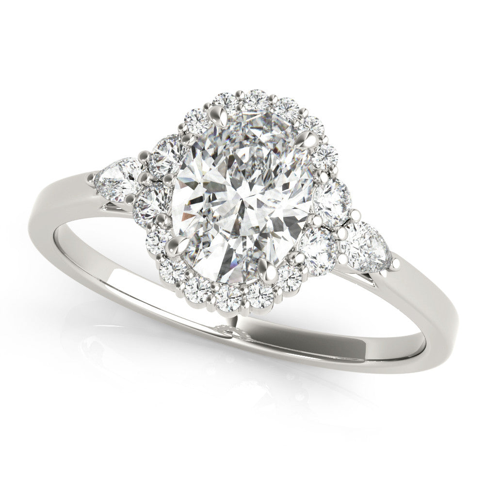 Platinum Oval Halo Diamond Ring with Pear Side Stones and Prong Setting on a Classic Band