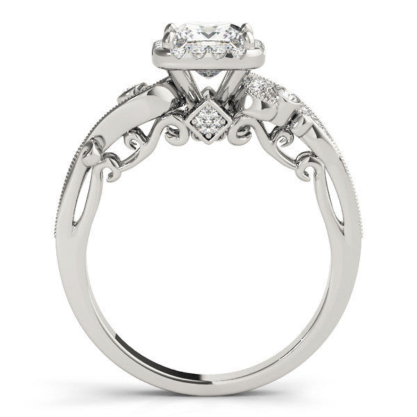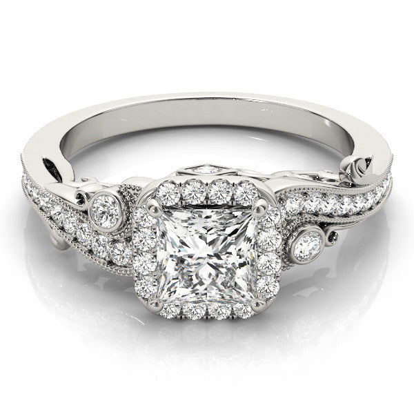 Platinum Princess Cut Halo Diamond Ring with Milgrain Pave Band and Four-Prong Setting