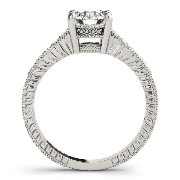 This exquisite engagement ring features a stunning Princess solitaire diamond set in a classic four-prong setting. The band is elegantly adorned with pavé-set diamonds, adding a continuous sparkle that complements the central stone. The intricate milgrain detailing along the edges of the band enhances its vintage charm, making it a timeless piece that captures both elegance and sophistication. Perfect for those who appreciate a blend of traditional craftsmanship and modern design.