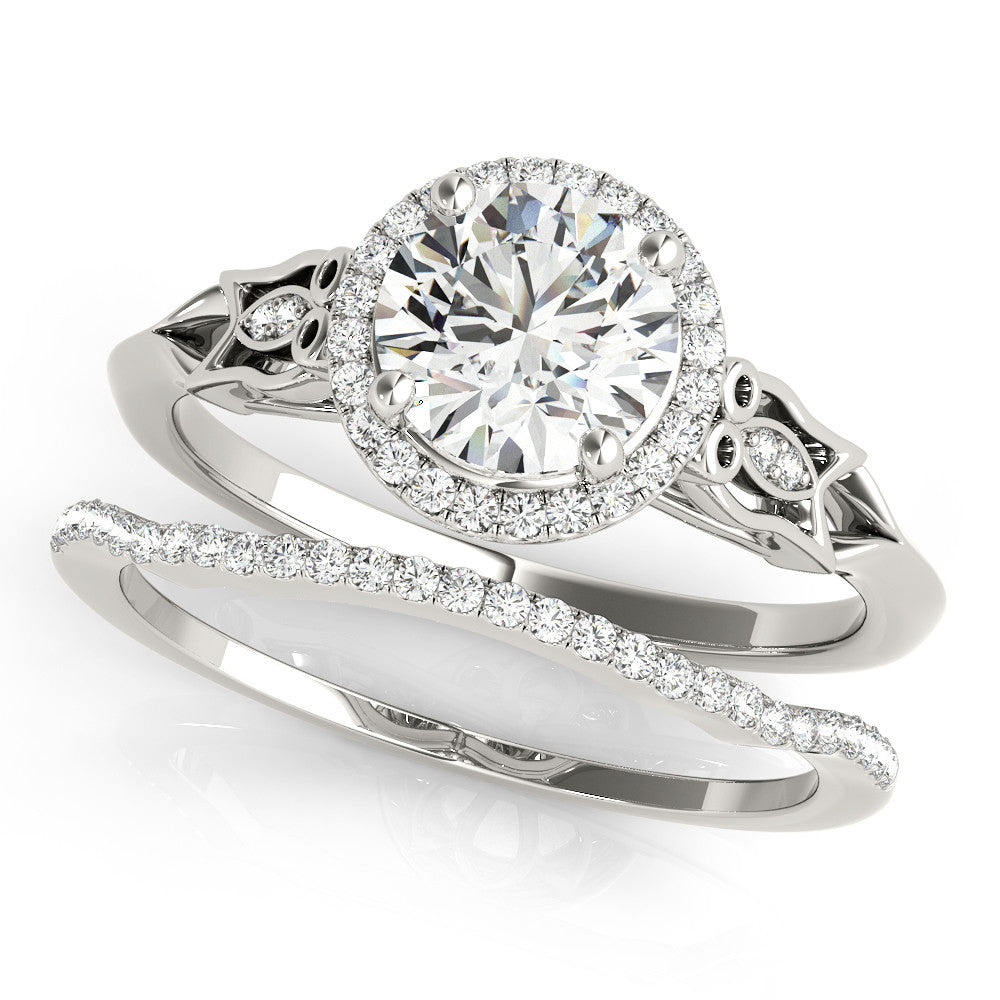This exquisite engagement ring features a stunning round-cut diamond encircled by a halo of smaller diamonds, enhancing its brilliance and size. The centerpiece is securely held in place by a classic four-prong setting, ensuring stability and elegance. The band is intricately designed with a filigree pattern, adding a touch of vintage charm and sophistication. This ring is a perfect blend of timeless elegance and modern craftsmanship, making it an ideal choice for a memorable proposal.