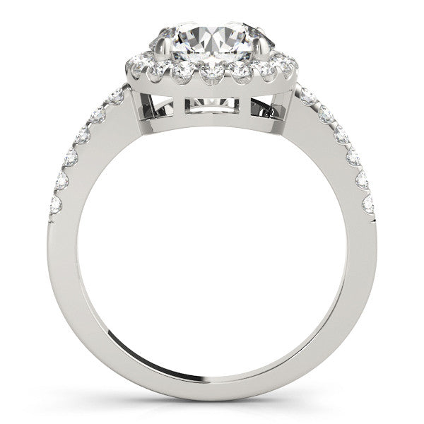 Platinum Round Halo Diamond Engagement Ring with Pavé Band and Four-Prong Setting
