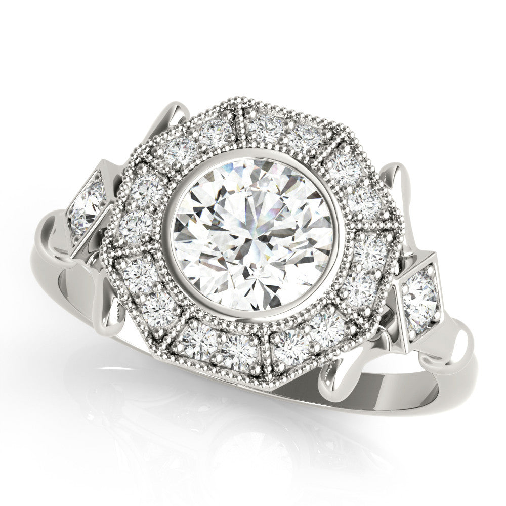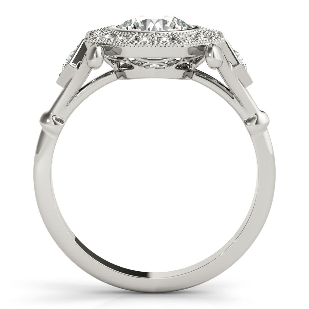 Platinum Round Halo Milgrain Diamond Ring with Split Shank and Bezel Setting