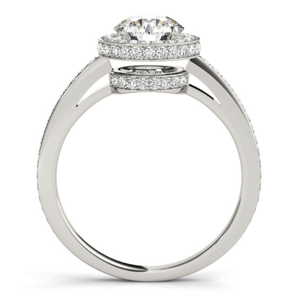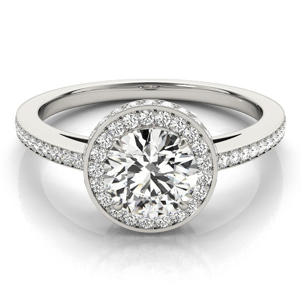 Platinum Round Halo Pave Band Solitaire Ring with Prong Setting
