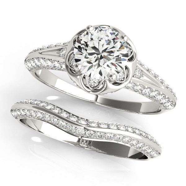 This exquisite ring features a dazzling round-cut diamond elegantly set in a halo design, enhancing its brilliance and size. The split shank band is adorned with pave-set diamonds, adding a touch of sparkle and sophistication. The unique petal prong setting securely holds the central stone, creating an intricate and romantic look. Perfect for those who appreciate a blend of classic elegance and modern design, this ring is a timeless symbol of love and commitment.
