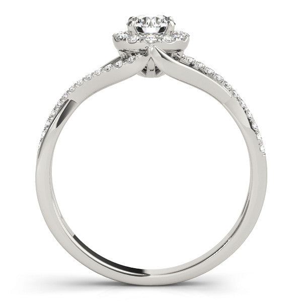 This exquisite ring features a round brilliant-cut diamond encircled by a sparkling halo of smaller diamonds, enhancing its brilliance and size. The unique twist band design is adorned with additional diamonds, creating a captivating and elegant look. The center stone is securely held in place by a classic prong setting, ensuring maximum light exposure for unparalleled sparkle. Perfect for those who appreciate a blend of timeless elegance and modern design, this ring is a stunning choice for any special occasion.