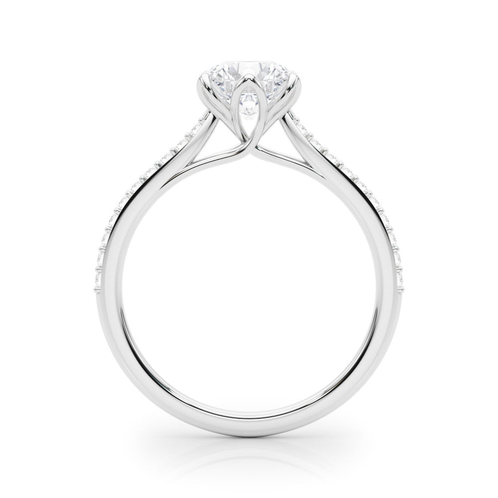 This exquisite engagement ring features a brilliant round solitaire diamond set in a classic six-prong setting, ensuring maximum light reflection and security. The elegant pave band is adorned with smaller diamonds, adding a touch of sparkle and sophistication to the overall design. Crafted in lustrous white gold, this ring beautifully combines timeless elegance with modern charm, making it a perfect symbol of everlasting love.