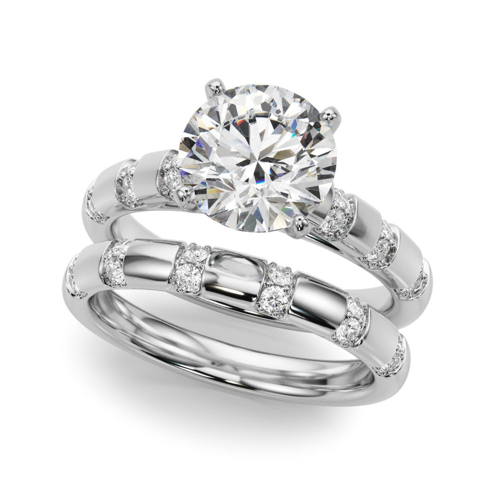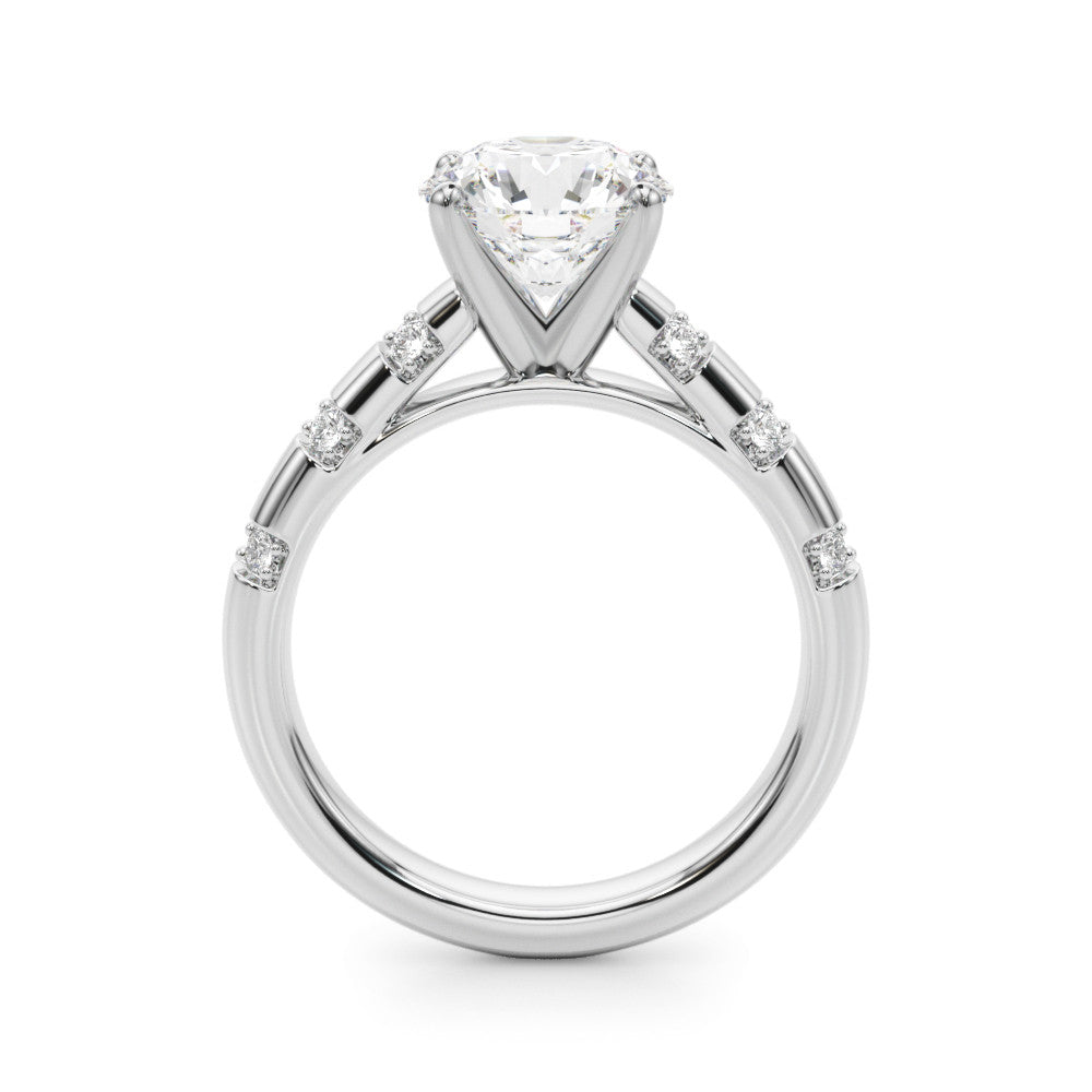 This exquisite ring showcases a stunning round solitaire diamond, expertly set in a classic four-prong setting that highlights its brilliance. The band is elegantly designed with channel-set diamonds, adding a touch of sophistication and sparkle. Perfect for those seeking timeless elegance, this ring is a beautiful symbol of everlasting love.