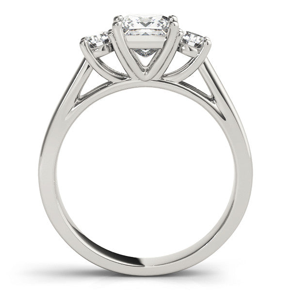 Platinum Three-Stone Princess Cut Solitaire Ring with Round Side Stones and Four-Prong Setting