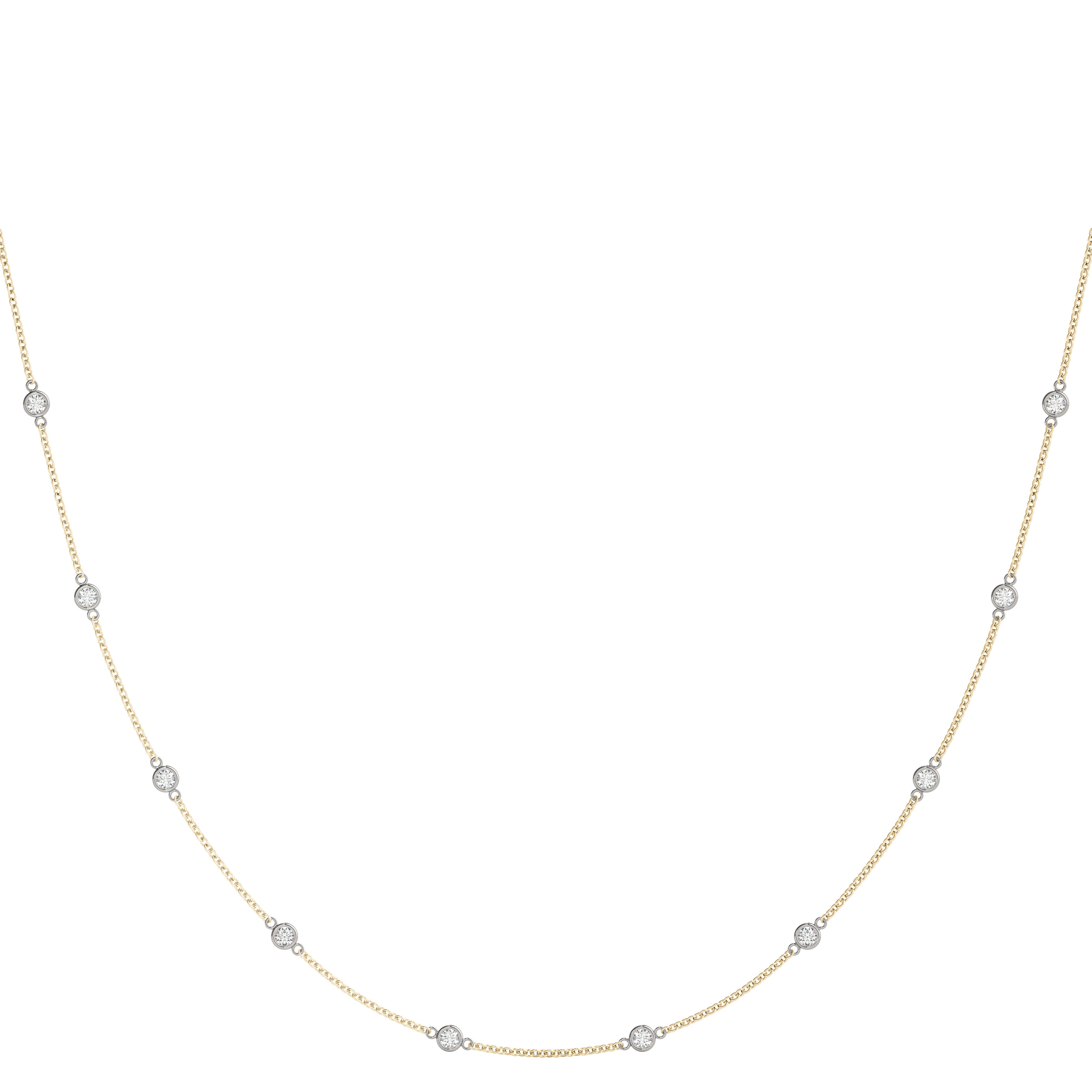 This elegant necklace features a delicate chain adorned with round diamonds, each securely held in a bezel setting. The minimalist design of the station necklace highlights the brilliance of the stones, making it a versatile piece perfect for any occasion. The bezel setting not only provides a modern look but also ensures the diamonds are protected, while the evenly spaced arrangement adds a touch of sophistication to the overall design.