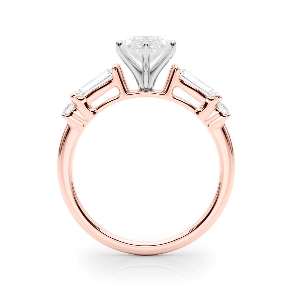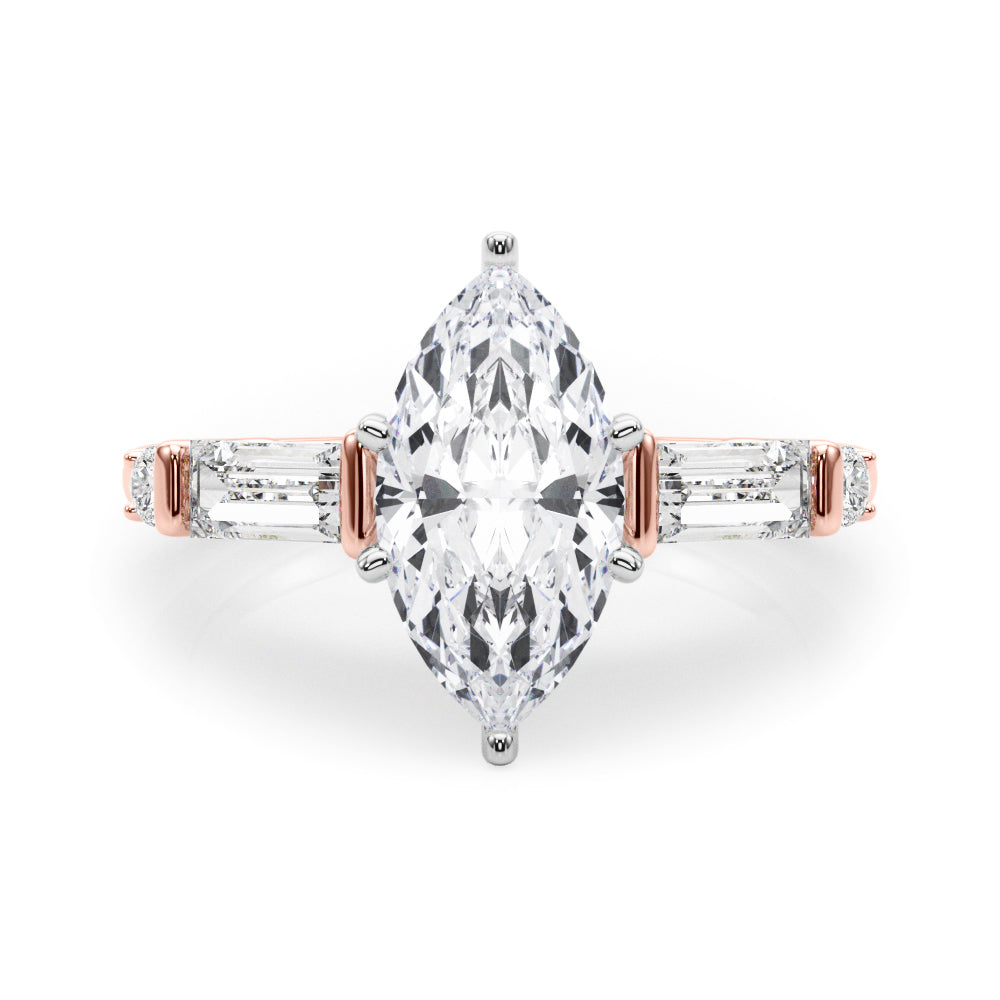 Rose gold Marquise Cut Diamond Ring with Baguette Side Stones, Channel Set Band, and Four-Prong Setting