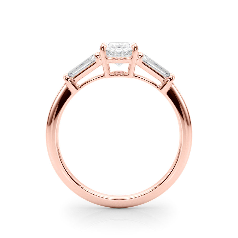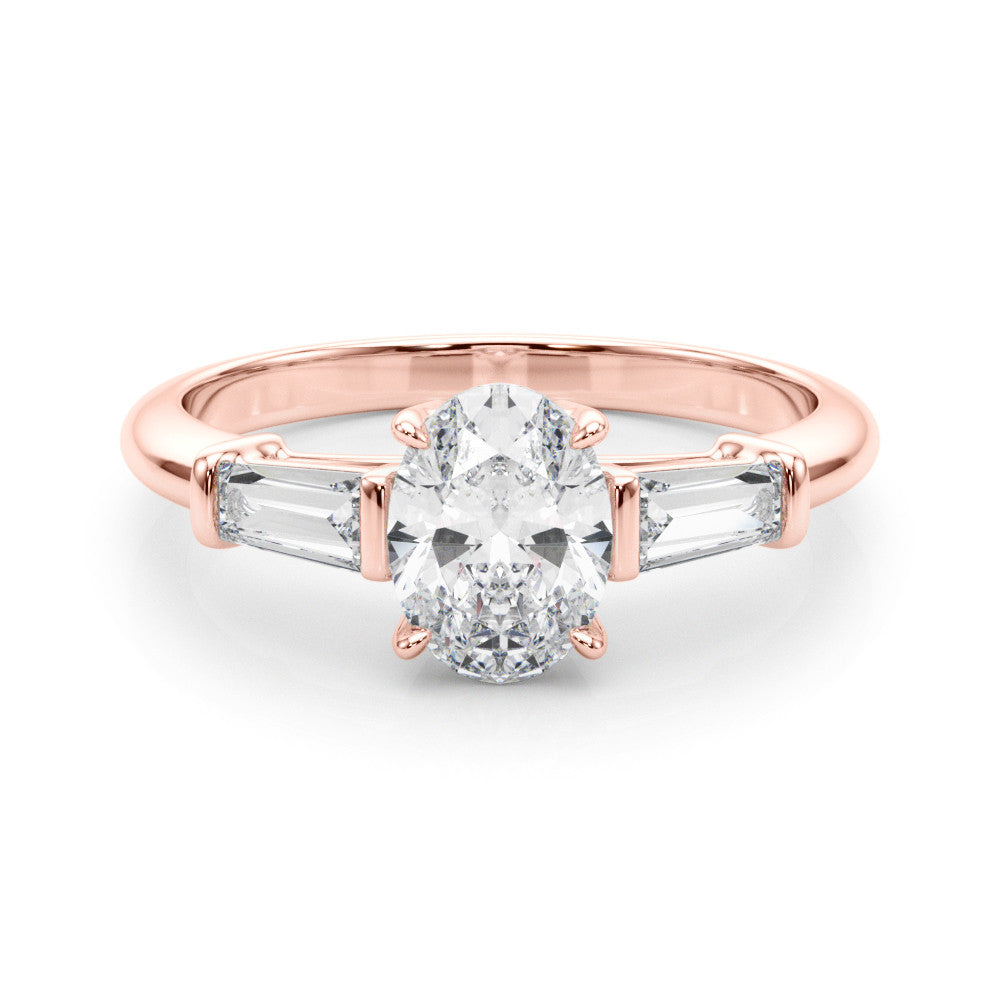 Rose gold Oval Cut Diamond Ring with Tapered Baguette Side Stones in Four-Prong Setting