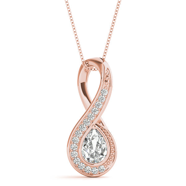 This elegant pendant features a stunning pear-shaped diamond at its center, securely held by a prong setting. The surrounding infinity loop design is adorned with pavé-set diamonds, adding a touch of brilliance and sophistication. Crafted in polished white gold, this pendant is a timeless piece that beautifully symbolizes eternal love and elegance, making it an exquisite addition to any jewelry collection.