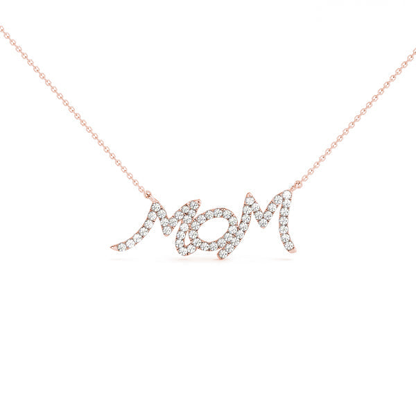 This elegant pendant features the word 'Mom' beautifully crafted in a delicate script style, adorned with sparkling round diamonds set in a pavé design. Each diamond is securely held in place with a prong setting, ensuring maximum brilliance and shine. The pendant is suspended from a fine chain, making it a perfect gift to celebrate and honor the special bond with a mother. Its timeless design and exquisite craftsmanship make it a cherished piece suitable for any occasion.