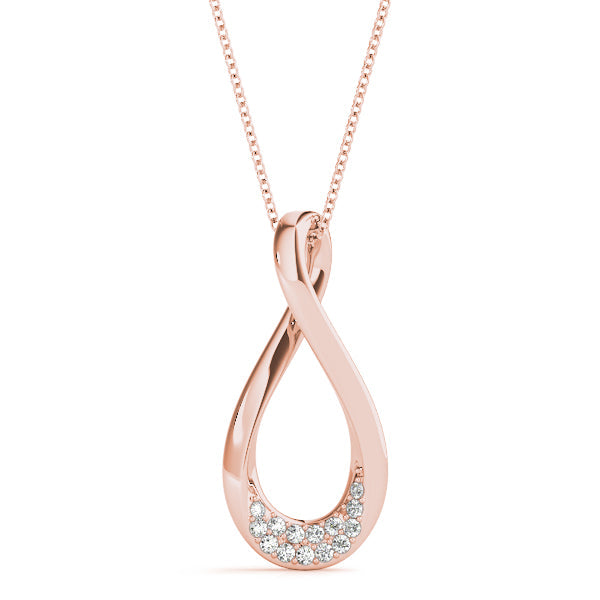 This elegant teardrop pendant features a graceful twist design, crafted in polished metal. The lower part of the pendant is adorned with a stunning pavé setting of round diamonds, creating a sparkling effect that captures light beautifully. The pendant is designed with a sleek prong setting, ensuring the diamonds are securely held while adding a touch of sophistication. Perfect for any occasion, this pendant is a timeless piece that complements any attire with its classic elegance.