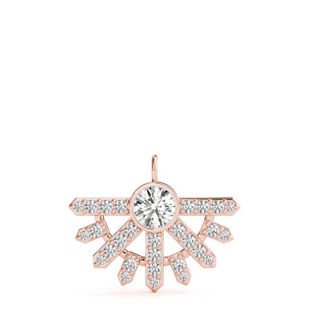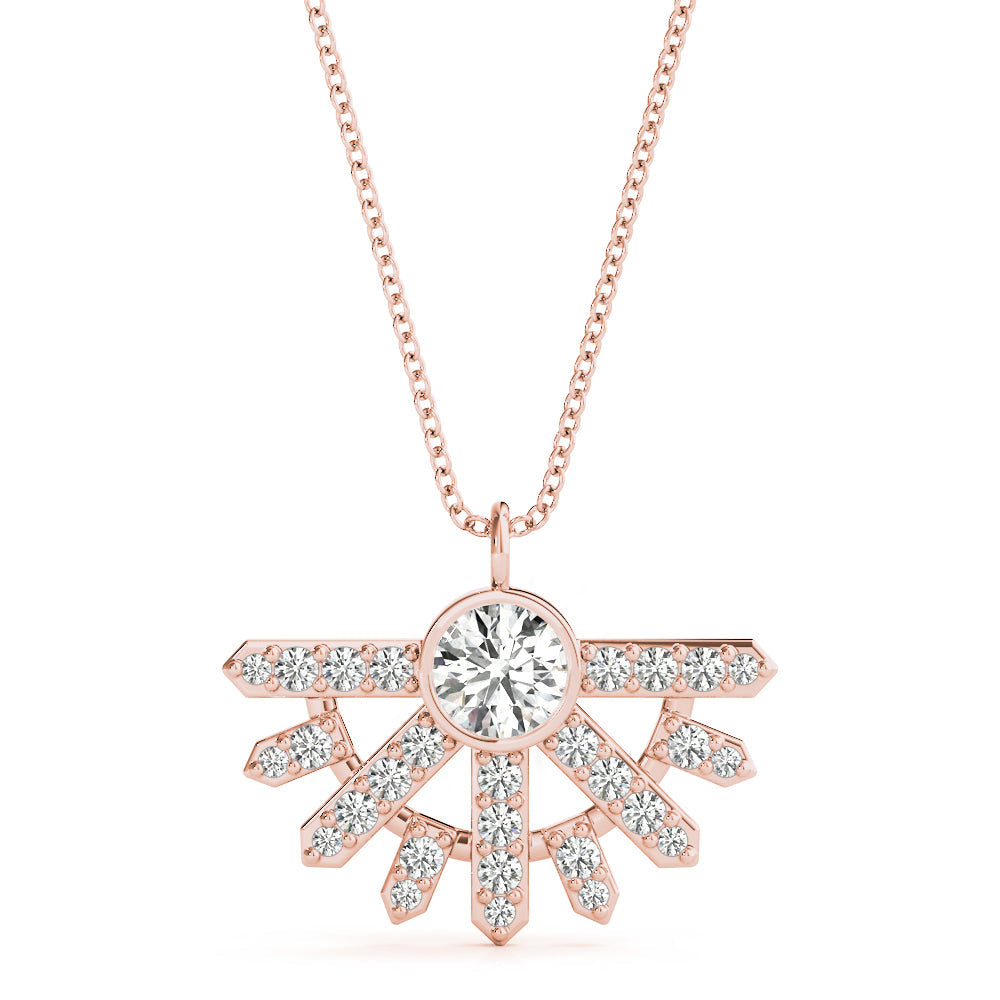 This exquisite pendant features a stunning round brilliant diamond at its center, elegantly encased in a halo setting that enhances its brilliance. The fan-shaped design is adorned with meticulously set pav� diamonds, adding a touch of sophistication and sparkle. The pendant is crafted with high-quality materials, ensuring durability and a luxurious finish. Perfect for any occasion, this pendant is a timeless piece that complements any outfit, making it a must-have addition to your jewelry collection.
