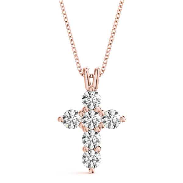 This exquisite pendant showcases a classic cross design, beautifully crafted with round diamonds in a prong setting. The shimmering stones are meticulously arranged to form the iconic cross shape, exuding elegance and sophistication. Perfect for any occasion, this pendant is a timeless piece that adds a touch of sparkle and grace to your ensemble.