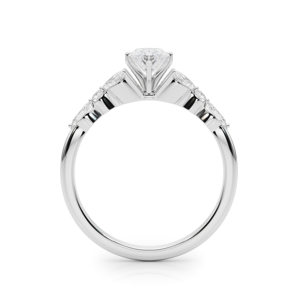 This exquisite ring features a stunning Marquise diamond as the centerpiece, elegantly set in a secure six-prong setting. The Silver band enhances the brilliance of the central stone, while additional side stones add a touch of sophistication and sparkle. Perfect for those seeking a timeless and elegant design, this ring is a beautiful symbol of love and commitment.