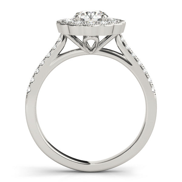 Silver Round Cut Halo Diamond Engagement Ring with Pavé Band and Four-Prong Setting