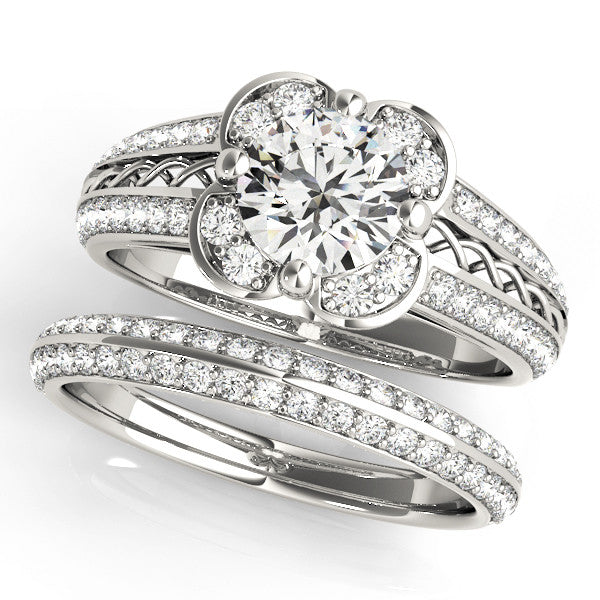 This exquisite engagement ring features a stunning round diamond set in a floral halo design, accentuated by a split shank band adorned with shimmering pave-set diamonds. The intricate lattice detailing on the band adds a touch of elegance, while the four-prong setting securely holds the central stone, making this ring a perfect blend of timeless beauty and modern sophistication.