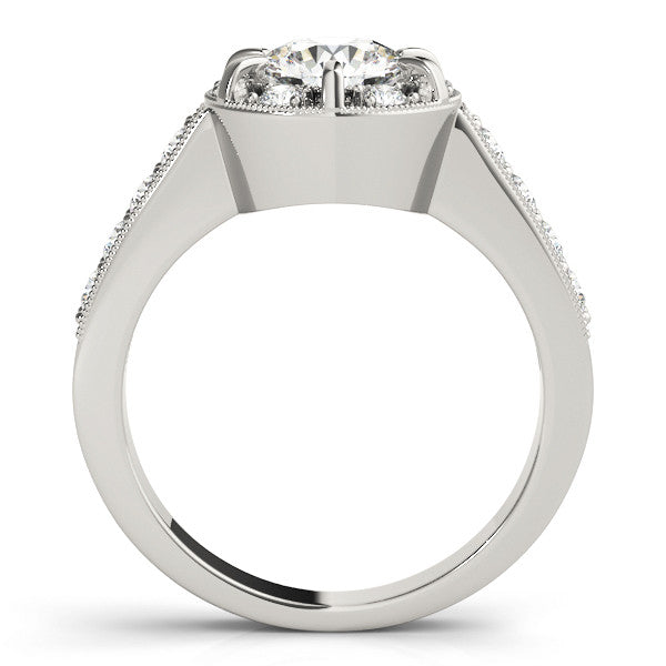Silver Round Halo Diamond Engagement Ring with Pave Band and Claw Prong Setting