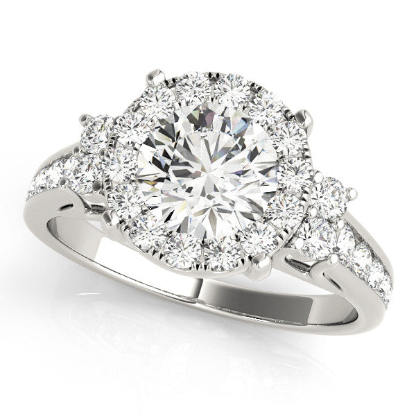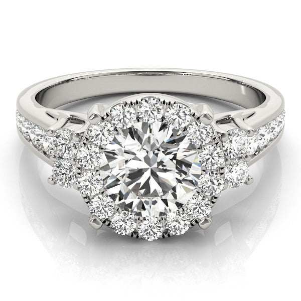 This exquisite engagement ring features a stunning round-cut diamond at its center, elegantly surrounded by a halo of smaller diamonds that enhance its brilliance. The split shank band is adorned with additional diamonds, adding to the ring's overall sparkle and sophistication. Secured in a classic four-prong setting, the central diamond is showcased beautifully, making this ring a perfect symbol of enduring love and commitment.