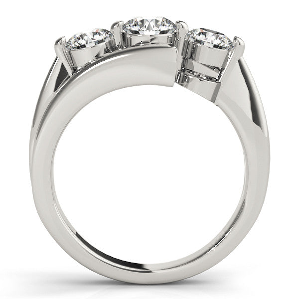 This exquisite ring features a stunning three-stone design with round brilliant diamonds, elegantly set in a sleek bypass band. Each diamond is securely held in place with a classic prong setting, allowing maximum light to enhance their brilliance. The modern bypass band adds a contemporary twist to the timeless three-stone style, making it a perfect choice for those looking to symbolize their past, present, and future with elegance and grace.