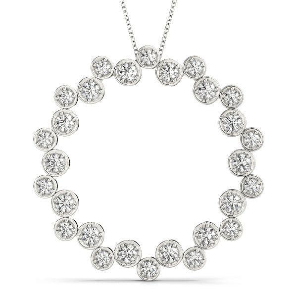 This elegant pendant features a stunning circular design adorned with round diamonds, each securely held in a sleek bezel setting. The modern arrangement of the stones creates a timeless and sophisticated look, perfect for both casual and formal occasions. Crafted with precision, the pendant hangs gracefully from a delicate chain, making it a versatile addition to any jewelry collection.