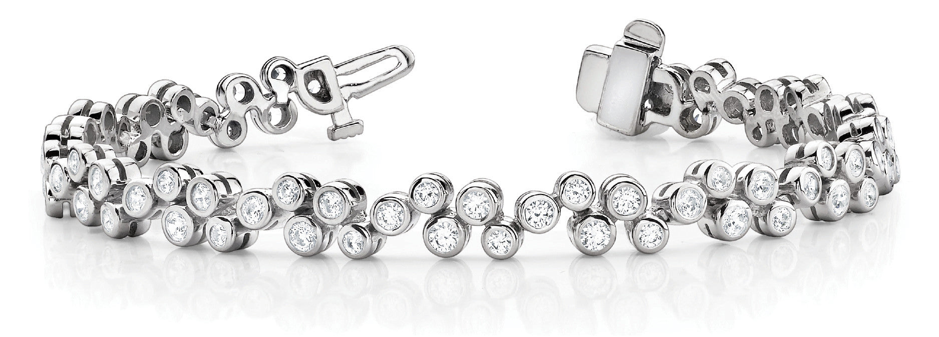 This exquisite tennis bracelet showcases a stunning array of round diamonds, each securely nestled within a sleek bezel setting. The diamonds are artfully arranged in a cluster design, creating a captivating sparkle that dances with every movement. Crafted from premium materials, the bracelet features a flexible band that elegantly wraps around the wrist, ensuring both comfort and style. The bezel setting not only enhances the brilliance of the stones but also offers a modern twist on a classic prong setting, making this piece a timeless addition to any jewelry collection.