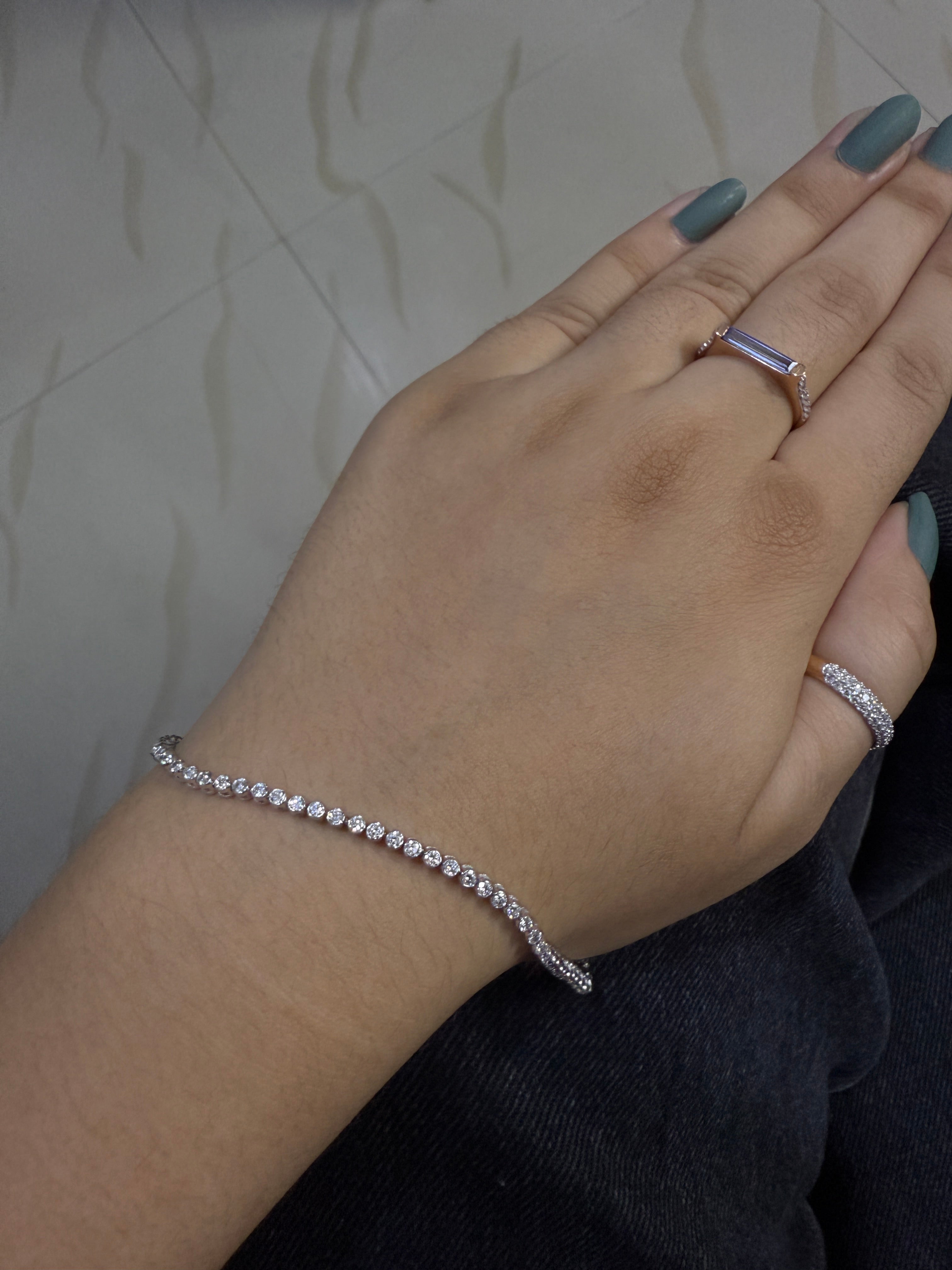 This exquisite bracelet showcases a classic tennis design, featuring a continuous line of brilliant round diamonds, each securely nestled in a sleek bezel setting. The elegant stones are perfectly aligned along a polished metal band, offering a seamless and sophisticated look. The bracelet is fastened with a secure box clasp, ensuring both style and peace of mind. Ideal for both everyday elegance and special occasions, this piece adds a touch of timeless sparkle to any ensemble.