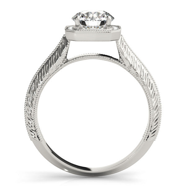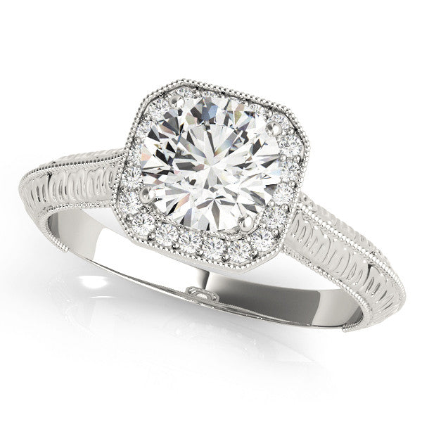 White gold Cushion Halo Round Solitaire Milgrain Engagement Ring