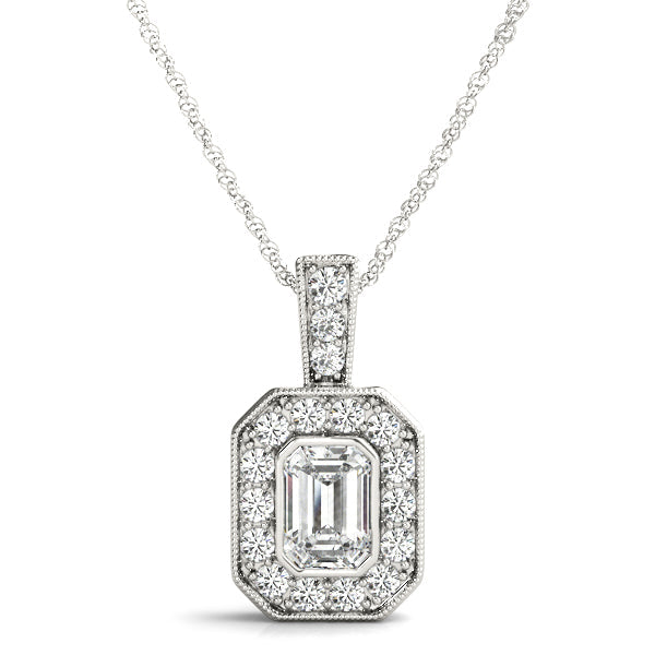 White gold Emerald Cut Halo Pendant with Milgrain Detail