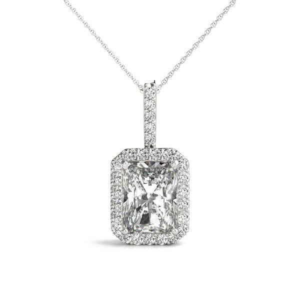 This exquisite pendant features a stunning emerald-cut diamond, elegantly encased in a classic halo setting that amplifies its brilliance. The centerpiece is securely held by prong settings, ensuring both beauty and durability. Surrounded by a delicate halo of smaller diamonds, this pendant captures light beautifully, creating a dazzling effect. Perfect for any occasion, this piece adds a touch of sophistication and elegance to any outfit.