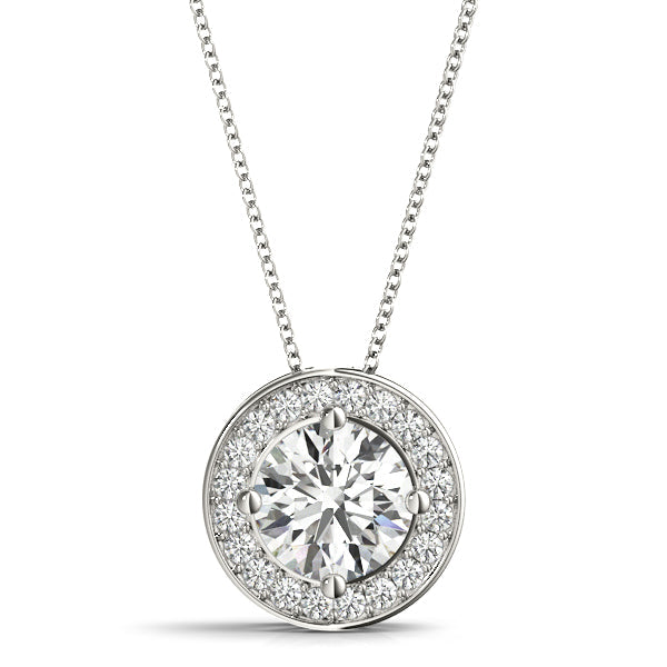 This exquisite pendant features a captivating round diamond at its center, elegantly secured by a four-prong setting. The central stone is beautifully encircled by a halo of smaller diamonds, enhancing its brilliance and creating a stunning visual impact. The side view reveals intricate metalwork that adds a touch of sophistication and elegance. Perfect for any occasion, this pendant combines timeless design with modern elegance, making it a cherished addition to any jewelry collection.