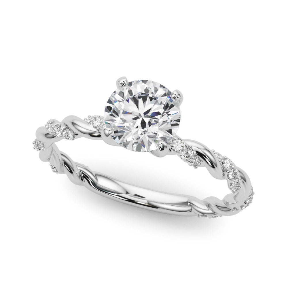 This exquisite ring features a brilliant round solitaire diamond elegantly set in a classic four-prong setting, ensuring maximum light reflection and sparkle. The band is intricately designed with a twisted style, adorned with delicate pavé diamond accents that add a touch of sophistication and glamour. Perfect for those who appreciate timeless elegance with a modern twist, this ring is a stunning choice for any special occasion.