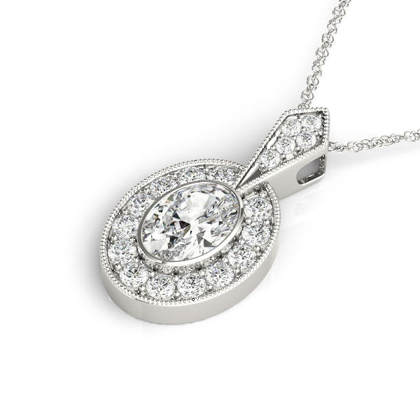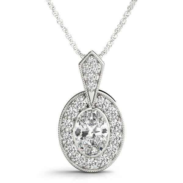 This exquisite Oval Halo Pavé Diamond Pendant features a stunning oval-shaped central diamond, surrounded by a halo of sparkling pave-set diamonds. The intricate design showcases a prong setting that elevates the central stone, enhancing its brilliance and elegance. Perfect for any occasion, this pendant is a timeless piece that adds a touch of sophistication and glamour to any ensemble.