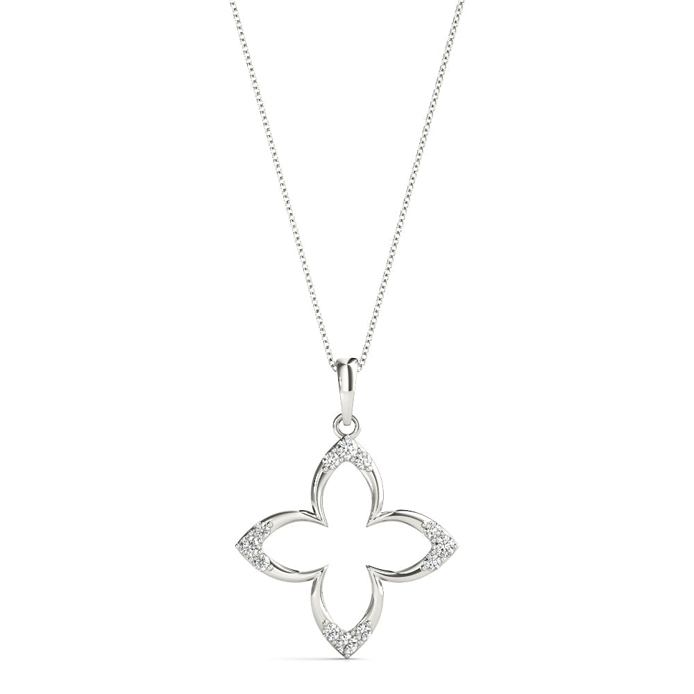 This exquisite pendant features a delicate openwork design in a marquise shape, adorned with shimmering pavé-set diamonds. The stones are securely held in place with elegant prong settings, enhancing their brilliance and sparkle. Crafted in lustrous metal, this pendant offers a sophisticated and timeless appeal, perfect for adding a touch of elegance to any ensemble.