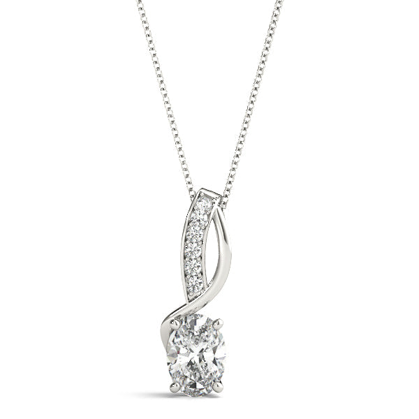 This elegant pendant features a stunning oval-shaped solitaire diamond set in a classic four-prong setting, beautifully complemented by a pavé diamond-accented bail. The graceful twist of the bail adds a touch of sophistication, making it a perfect piece for any occasion. Crafted in lustrous white gold, this pendant captures the essence of timeless elegance and modern design, ensuring it will be a cherished addition to any jewelry collection.
