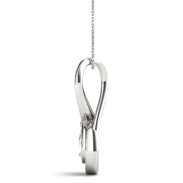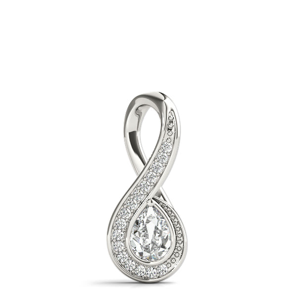 This elegant pendant features a stunning pear-shaped diamond at its center, securely held by a prong setting. The surrounding infinity loop design is adorned with pavé-set diamonds, adding a touch of brilliance and sophistication. Crafted in polished white gold, this pendant is a timeless piece that beautifully symbolizes eternal love and elegance, making it an exquisite addition to any jewelry collection.
