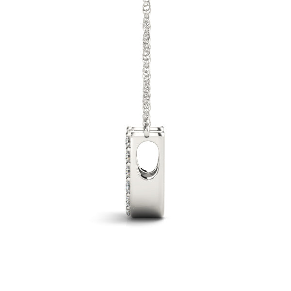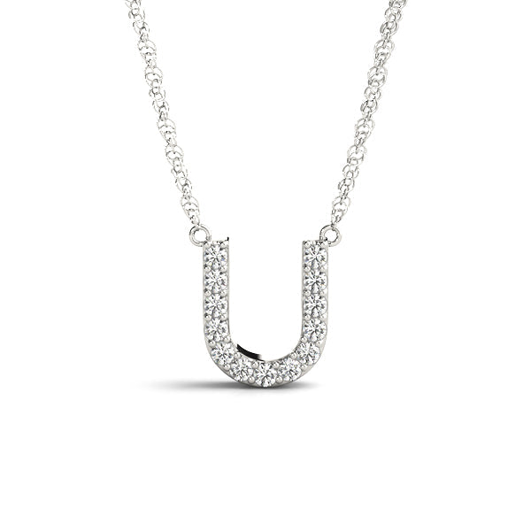 This elegant pendant features a beautifully crafted 'U' shape adorned with sparkling round diamonds in a pavé setting. The stones are securely held in place with prong settings, enhancing the pendant's brilliance and elegance. Suspended on a delicate chain, this piece is perfect for adding a touch of sophistication and personal style to any outfit. Whether for a special occasion or everyday wear, this pendant is a timeless addition to any jewelry collection.