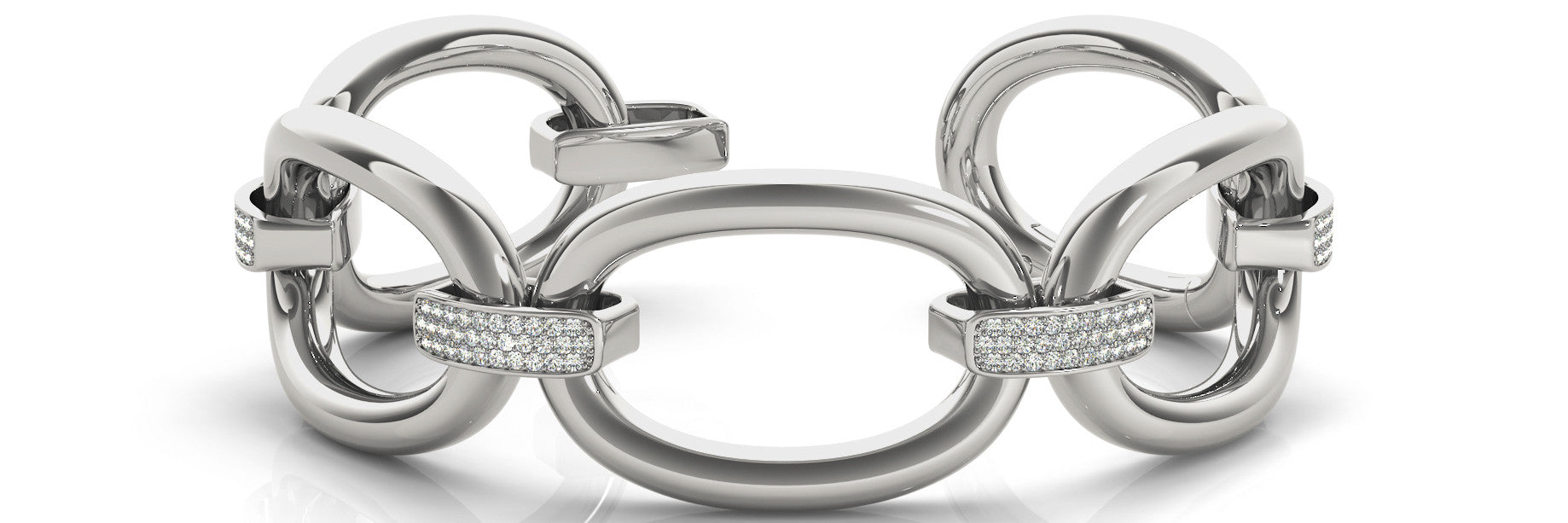 This exquisite bracelet features a bold link design crafted from polished metal, showcasing a series of interconnected oval links. Each link is adorned with a pavé setting of round stones, adding a touch of sparkle and elegance. The stones are securely held in place with a channel setting, ensuring durability and a seamless look. This bracelet is perfect for adding a sophisticated touch to any ensemble, making it a versatile and timeless addition to your jewelry collection.