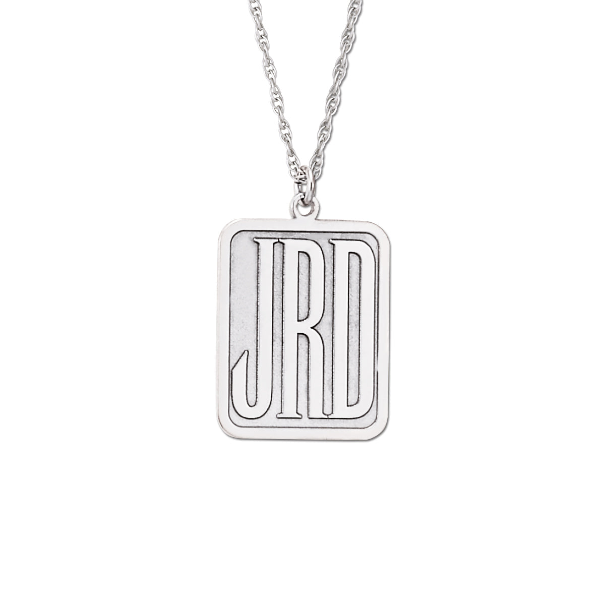 This elegant rectangular monogram pendant necklace, crafted in your choice of gold or silver finish, features a bold and stylish 'JRD' engraving. The pendant hangs from a classic twisted rope chain, adding a touch of sophistication to any outfit. Perfect for personalizing your look or giving as a thoughtful gift, this timeless piece combines modern design with a personal touch, making it a versatile accessory for any occasion.