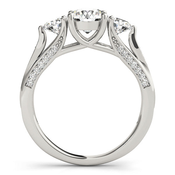 This exquisite engagement ring features a stunning round brilliant three-stone design, elegantly set in a classic prong setting. The centerpiece is complemented by two smaller round diamonds on either side, creating a harmonious and timeless look. The band showcases a split shank design, adorned with delicate pavé-set diamonds that add an extra touch of sparkle and sophistication. Crafted in lustrous white gold, this ring embodies elegance and romance, making it the perfect symbol of everlasting love.
