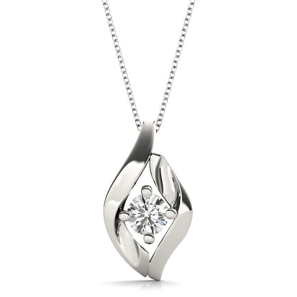 This elegant pendant features a round diamond securely nestled within a bezel setting, embraced by a graceful leaf-inspired design. The diamond is held in place with four prongs, enhancing its brilliance while maintaining a modern aesthetic. Crafted in polished metal, this pendant exudes sophistication and style, making it a perfect accessory for any occasion. Its unique shape and exquisite craftsmanship ensure that it stands out as a statement piece, adding a touch of luxury to your ensemble.